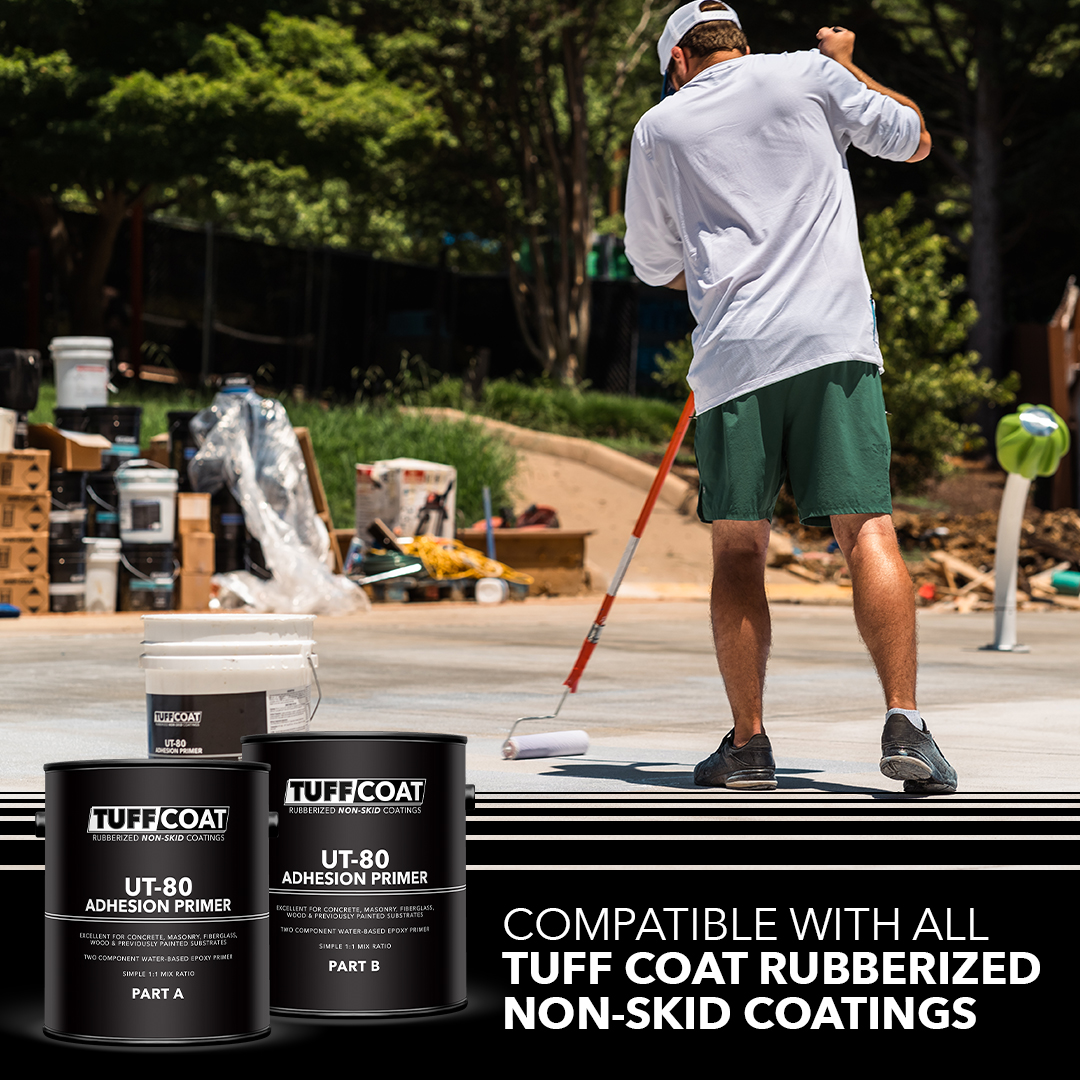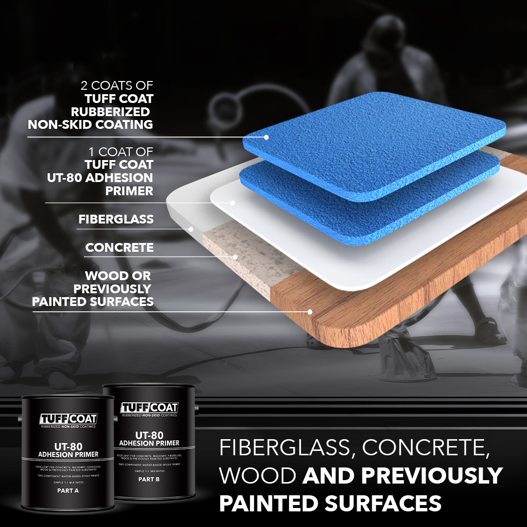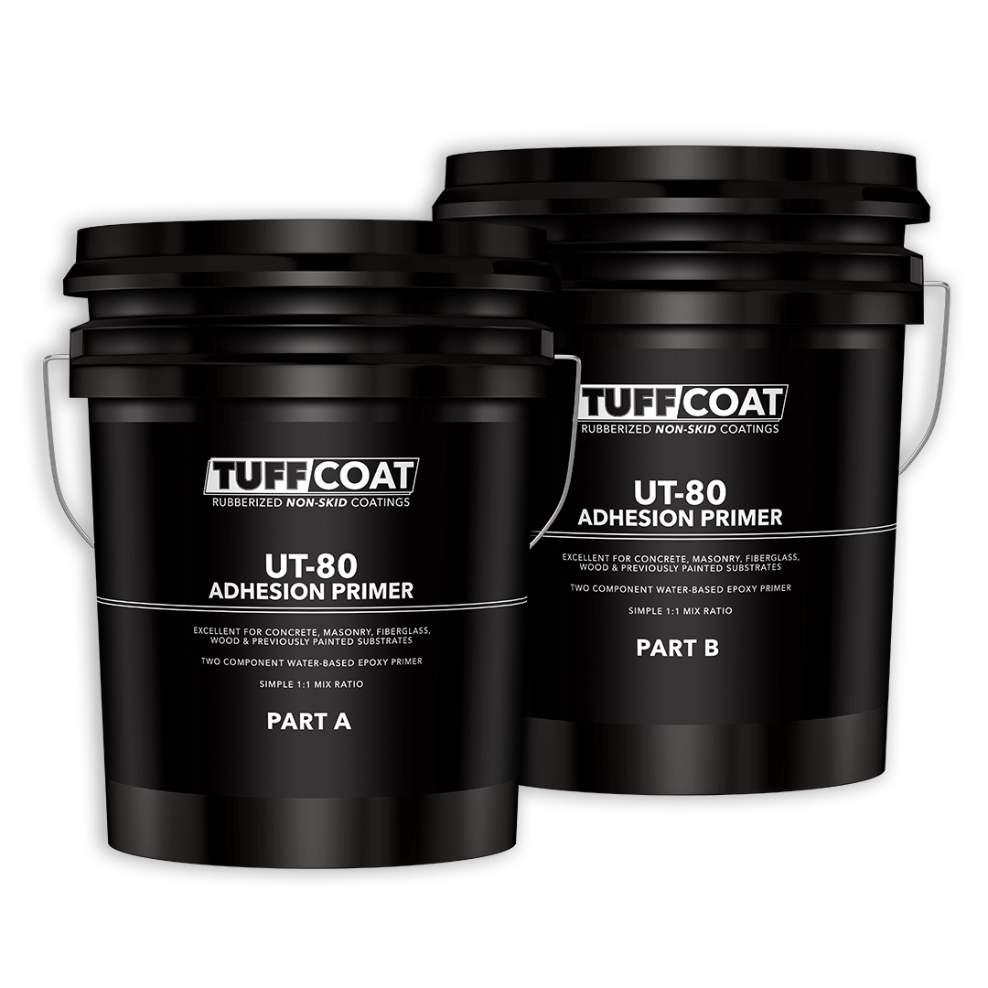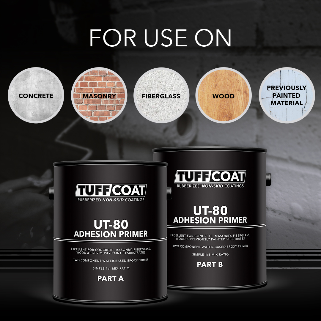 This two-component water-based epoxy primer/sealer can be used on concrete, wood, fiberglass and painted surfaces for heavy use and moisture areas. Tuff Coat UT-80 can be applied to damp concrete surfaces. This primer is compatible with all Tuff Coat rubberized non-skid coatings.